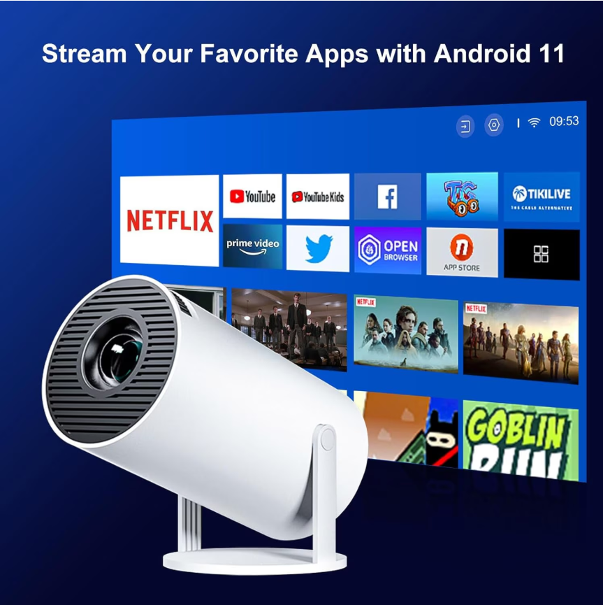 Acest mini-videoproiector dispune de Android TV 11.0, oferind acces la mii de aplicații (Netflix, YouTube etc.), transformând proiectorul într-un mic „smart TV”.